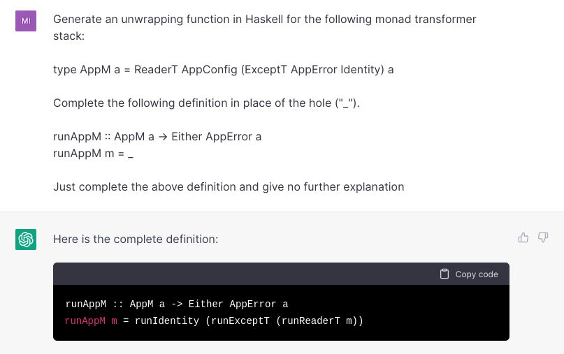 Try prompting ChatGPT to generate the Haskell definition we worked on though, and it does decently well: