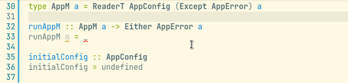 This type alias stacks three monads, Identity, ExceptT and ReaderT so that a function that returns this type has access to both effects, with the dummy identity computation at the bottom. One annoying part of working with code like this is at some point, you need to unwrap a computation of type AppM a into the inner value a. To do this, we need to write a boilerplate function that looks like this: