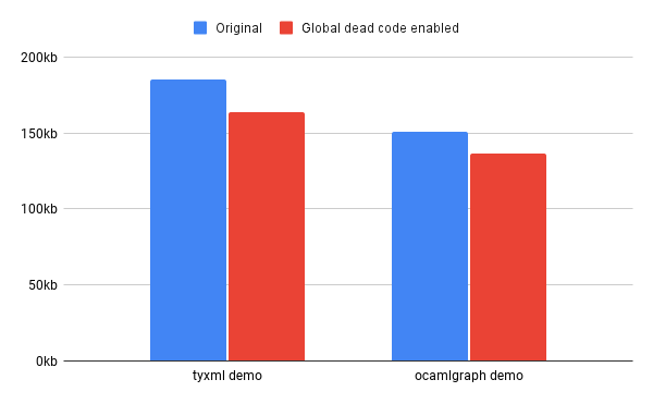 When we compile this program with js_of_ocaml we find the size of the generated JavaScript is 33kb. But with the new pass enabled, that size becomes just 24kb, a reduction by about 27%!